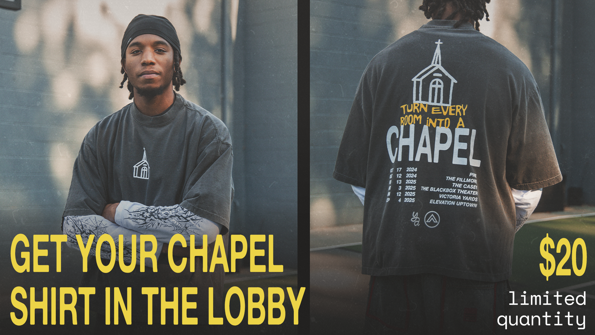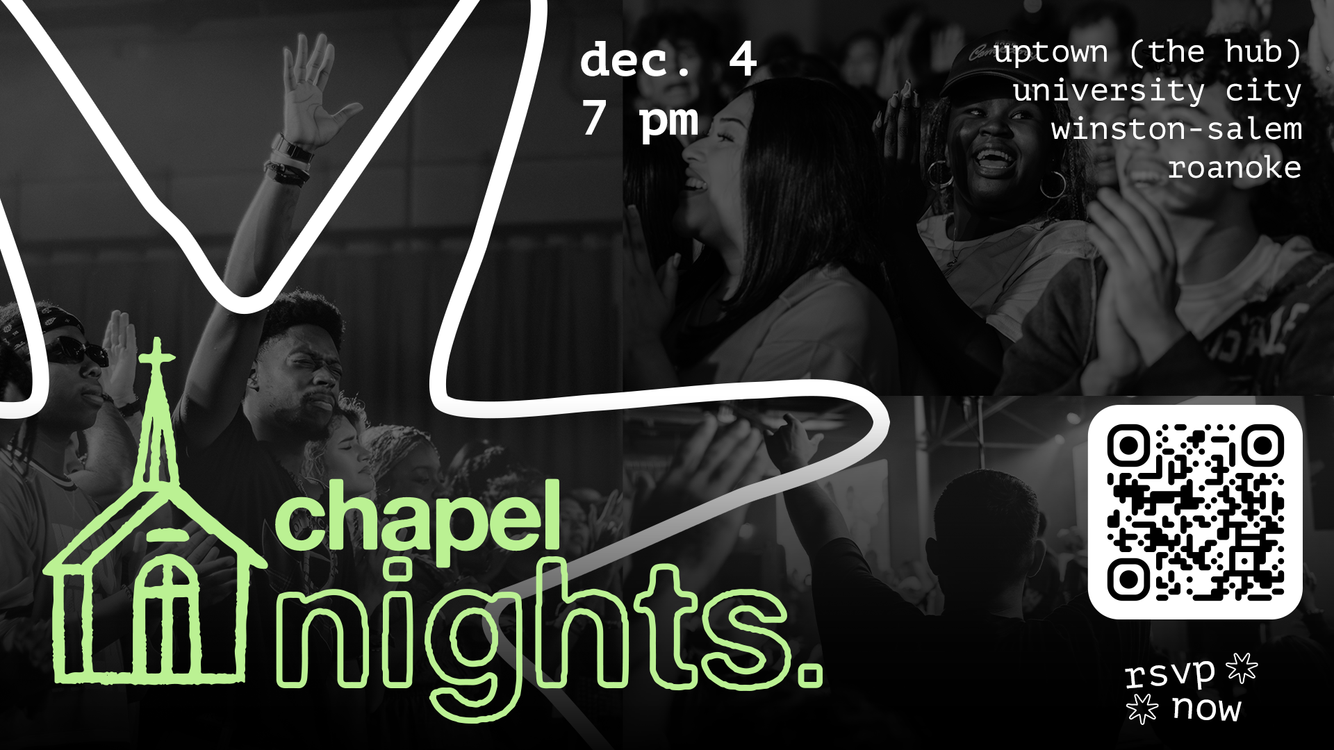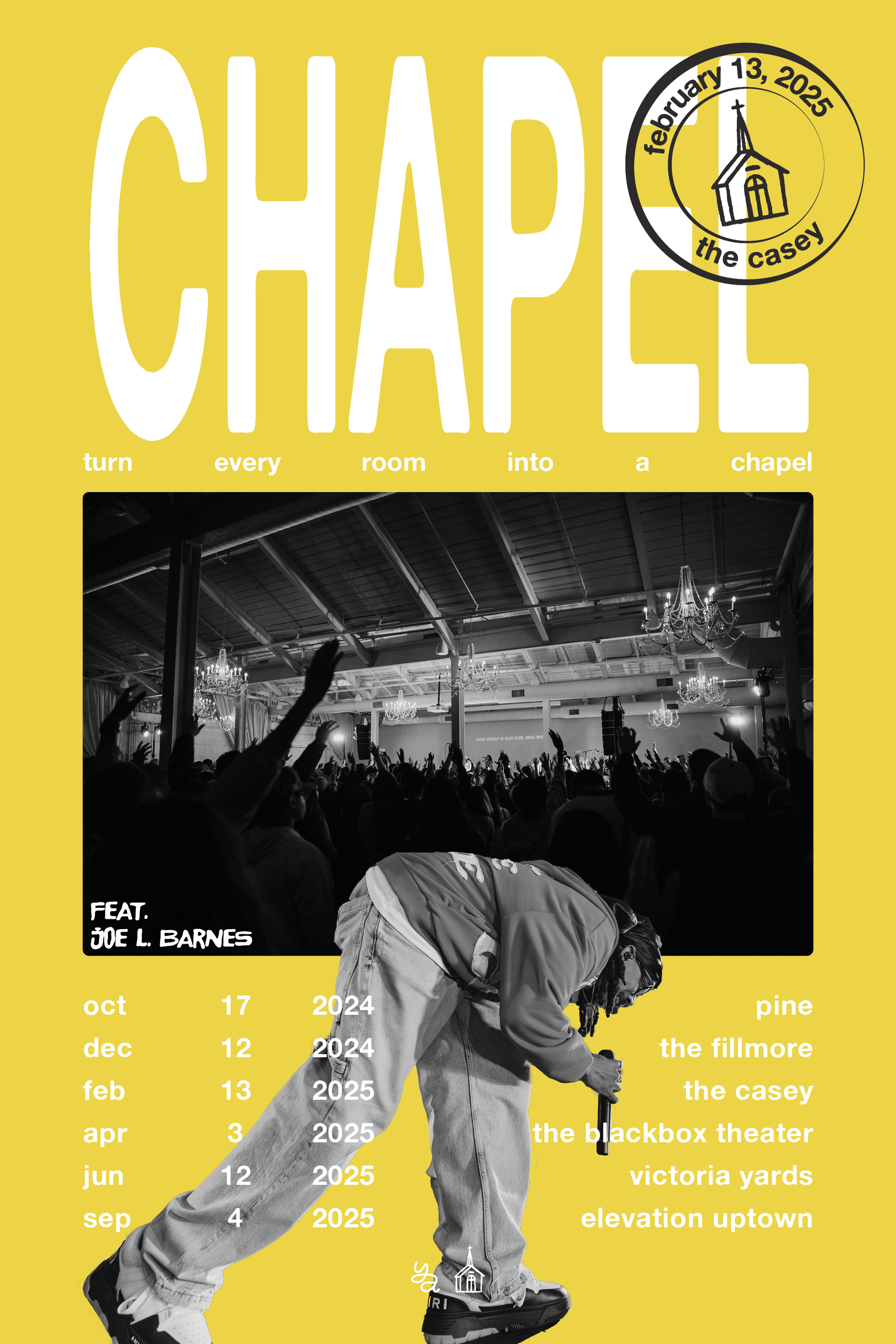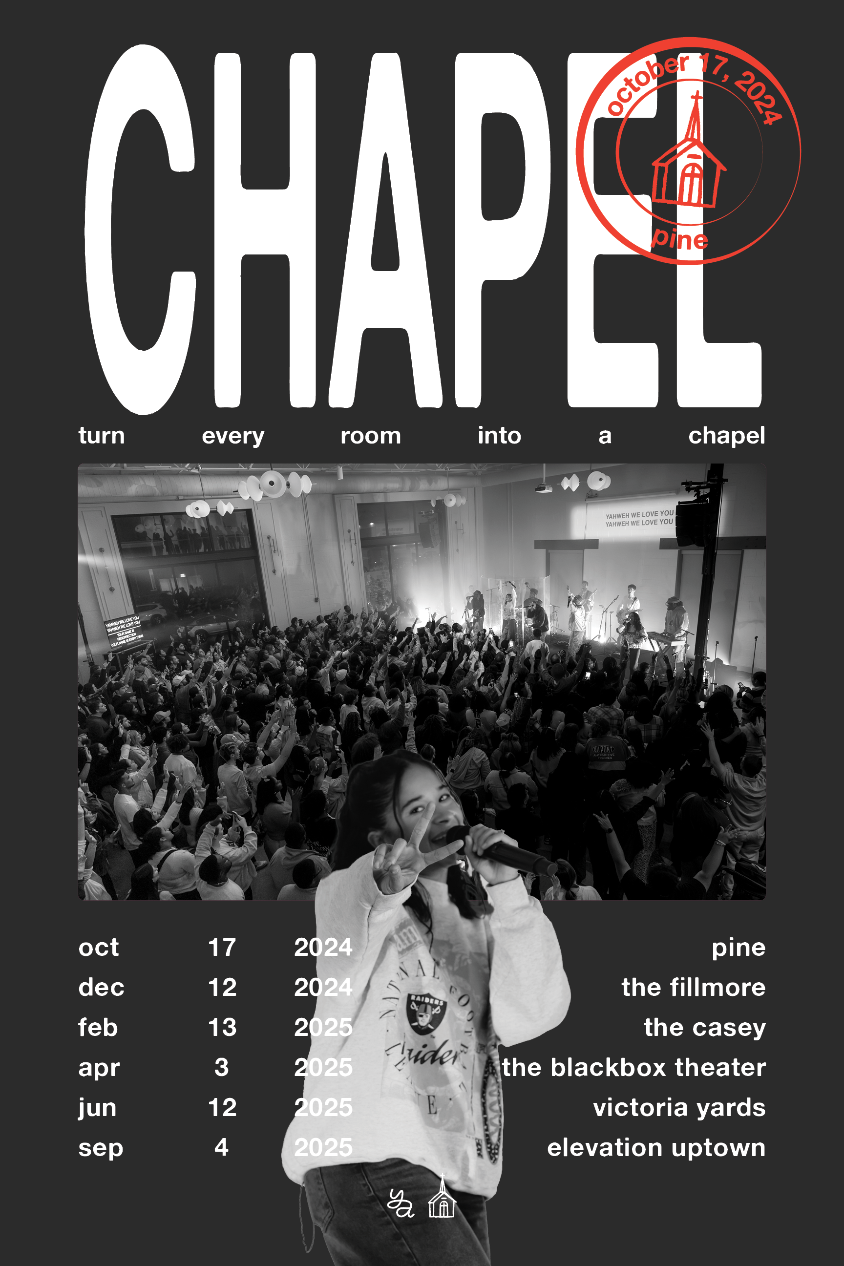 Because this was the one-year birthday of Chapel, the Young Adults Pastor wanted to honor the gatherings that came before it. To do this, we created posters inspired by concert posters, highlighting the details of each previous Chapel and showcasing any special guests who had been part of those moments.