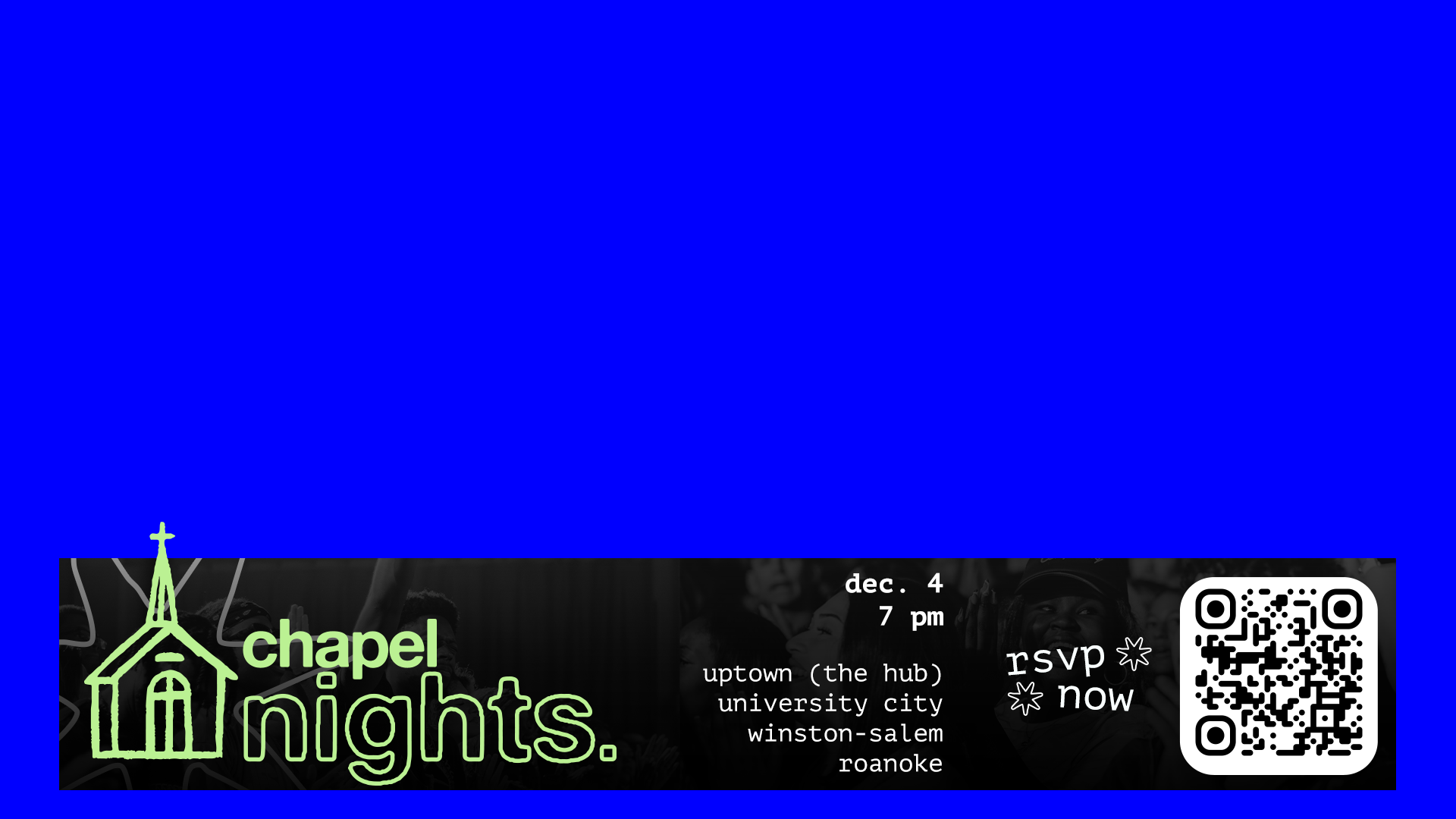 Screen support included name lower-thirds, scripture layouts, and marketing slides. These assets were used in the pre-service loop and again during closing announcements to inform young adults of events, apparel, and more.